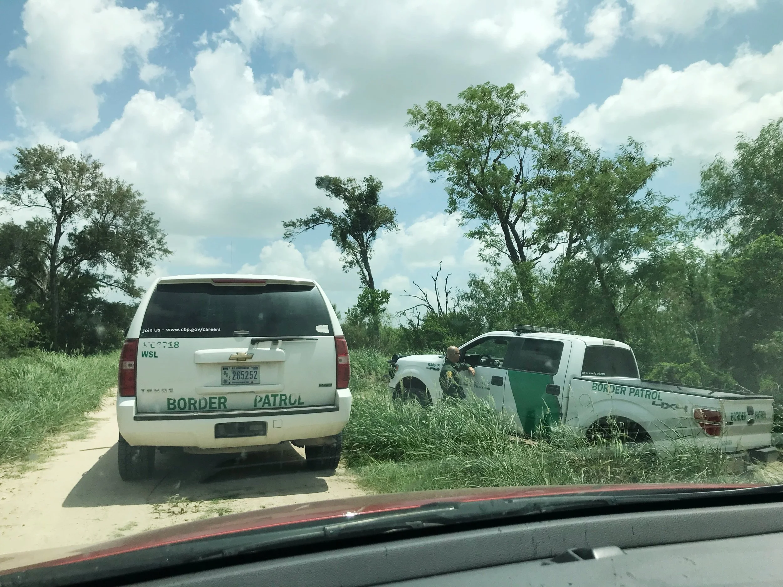 Disappointed we had failed to actually see the river, we returned to the car and drove back toward the main road. As we neared the beginning of the path, I could see in the distance a Border Patrol SUV blocking our path and the officer standing behind it. As soon as I pulled up behind him a second Border Patrol vehicle drove up an embankment and parked next to the SUV.
